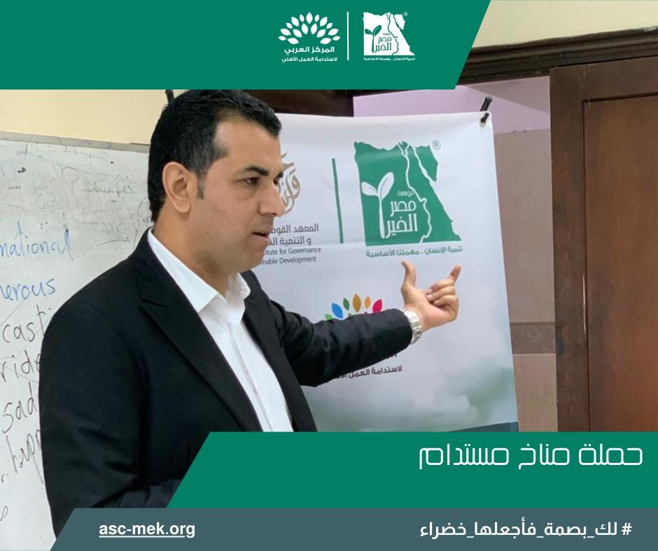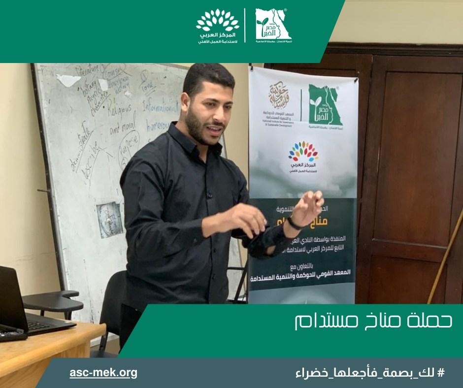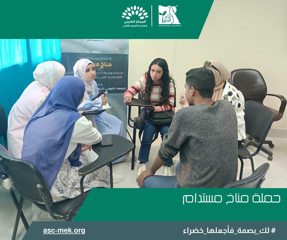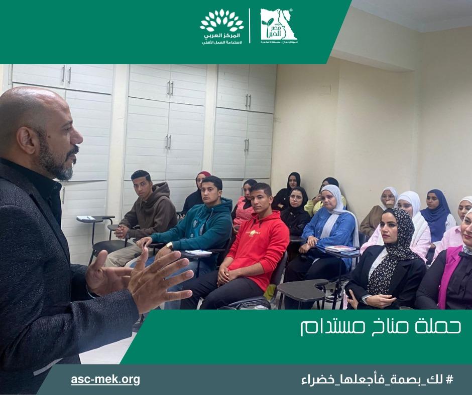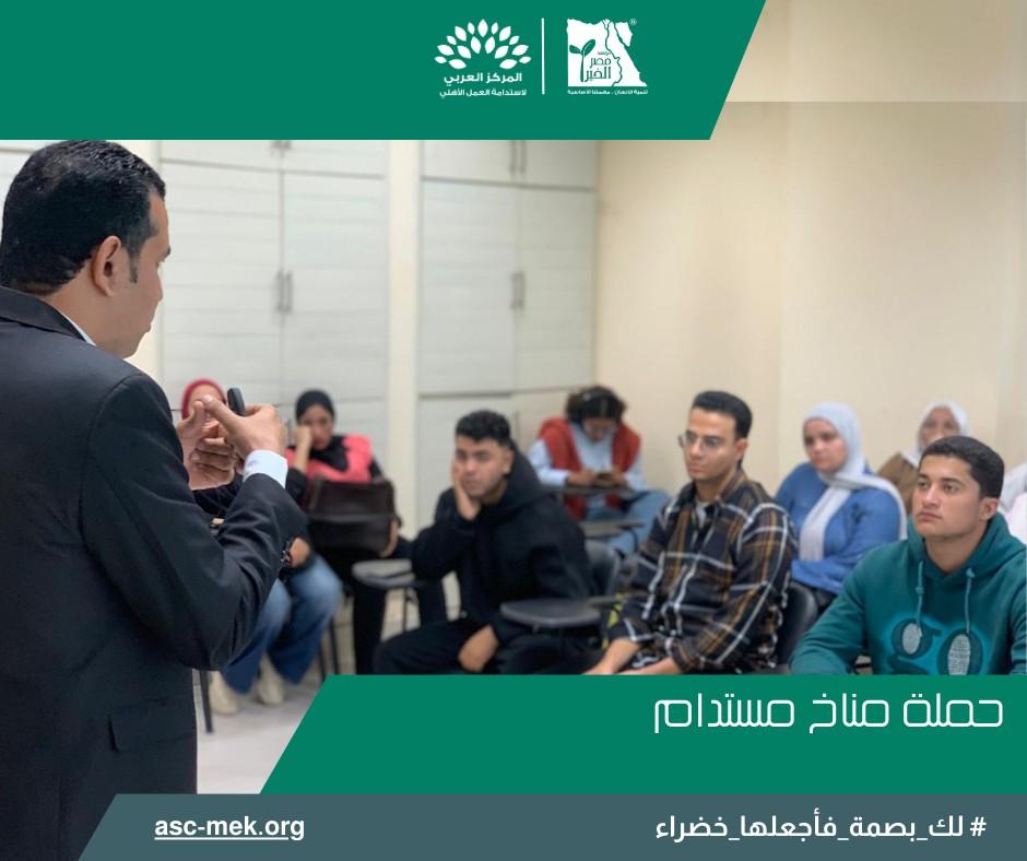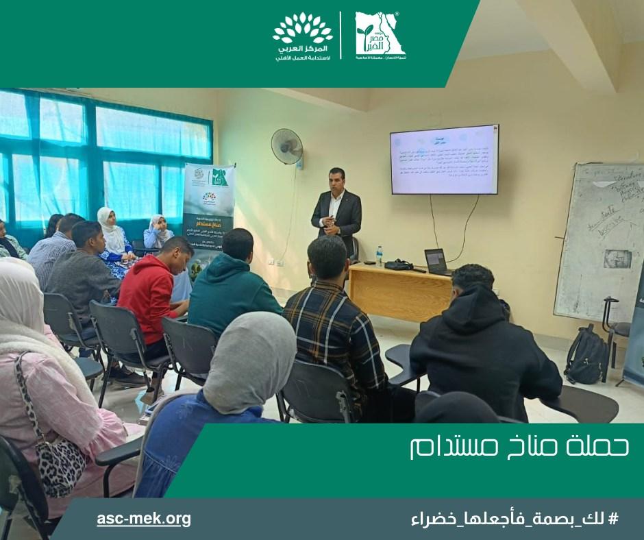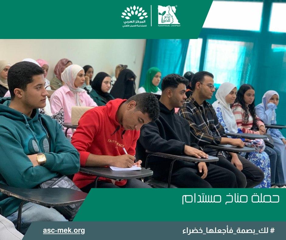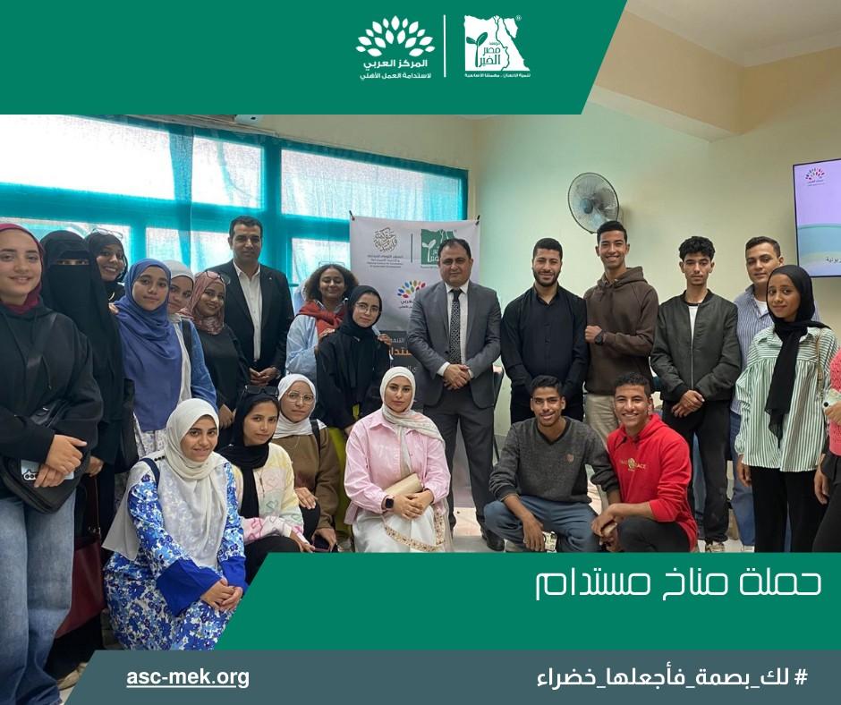 في إطار الحملة الإقليمية "مناخ مستدام"، نفّذ المركز العربي لاستدامة العمل الأهلي التابع لمؤسسة مصر الخير ورشة عمل حول العمل المناخي والتغيرات المناخية، وذلك بجامعة الفيوم، وبمشاركة 40 شابًا وشابة.