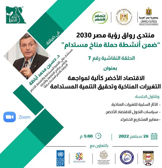 We invite you to participate in the monthly discussion panel of “Egypt Vision 2030 Gallery” Session title "Green economy as a mechanism to confront climate change and achieve sustainable development" Hosted by Dr. Hussein Mohamed Abaza .. International consultant for sustainable development and economics Al-Akhdar, former head of the International Economy and Trade Program at the United Nations, where the panel discussion will address many important points about: